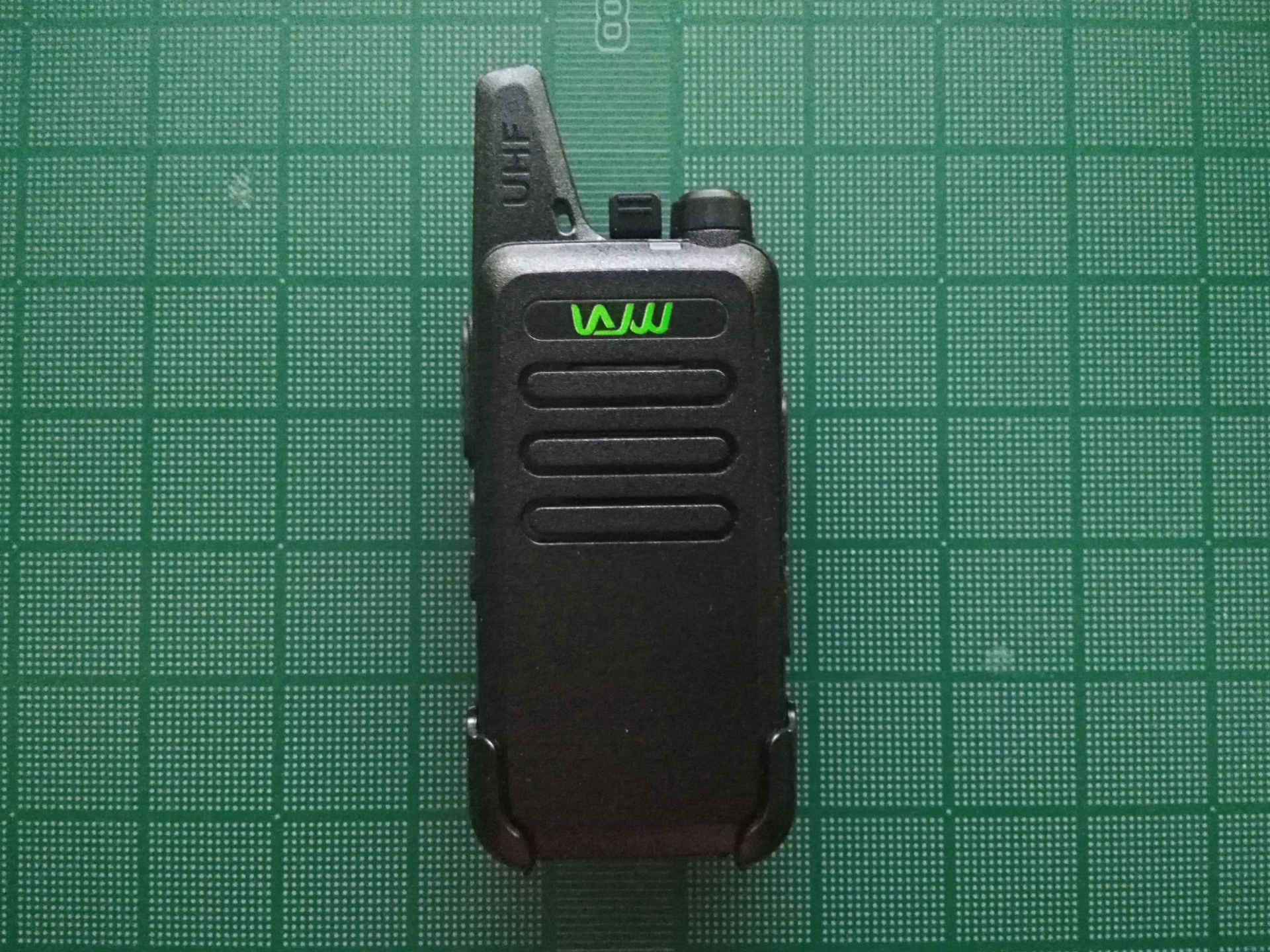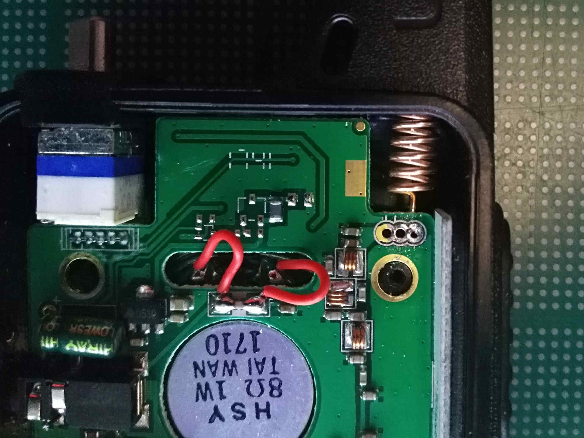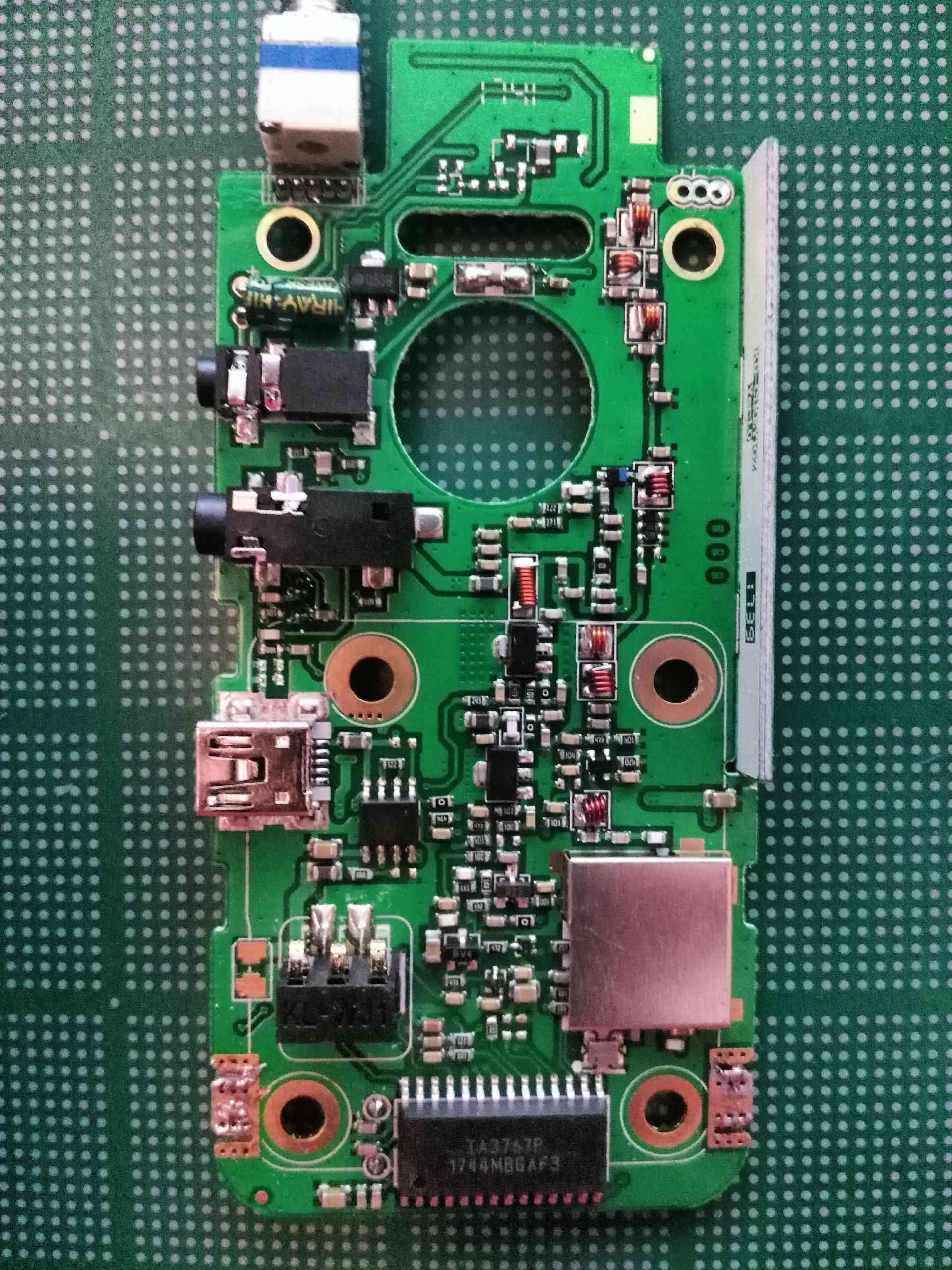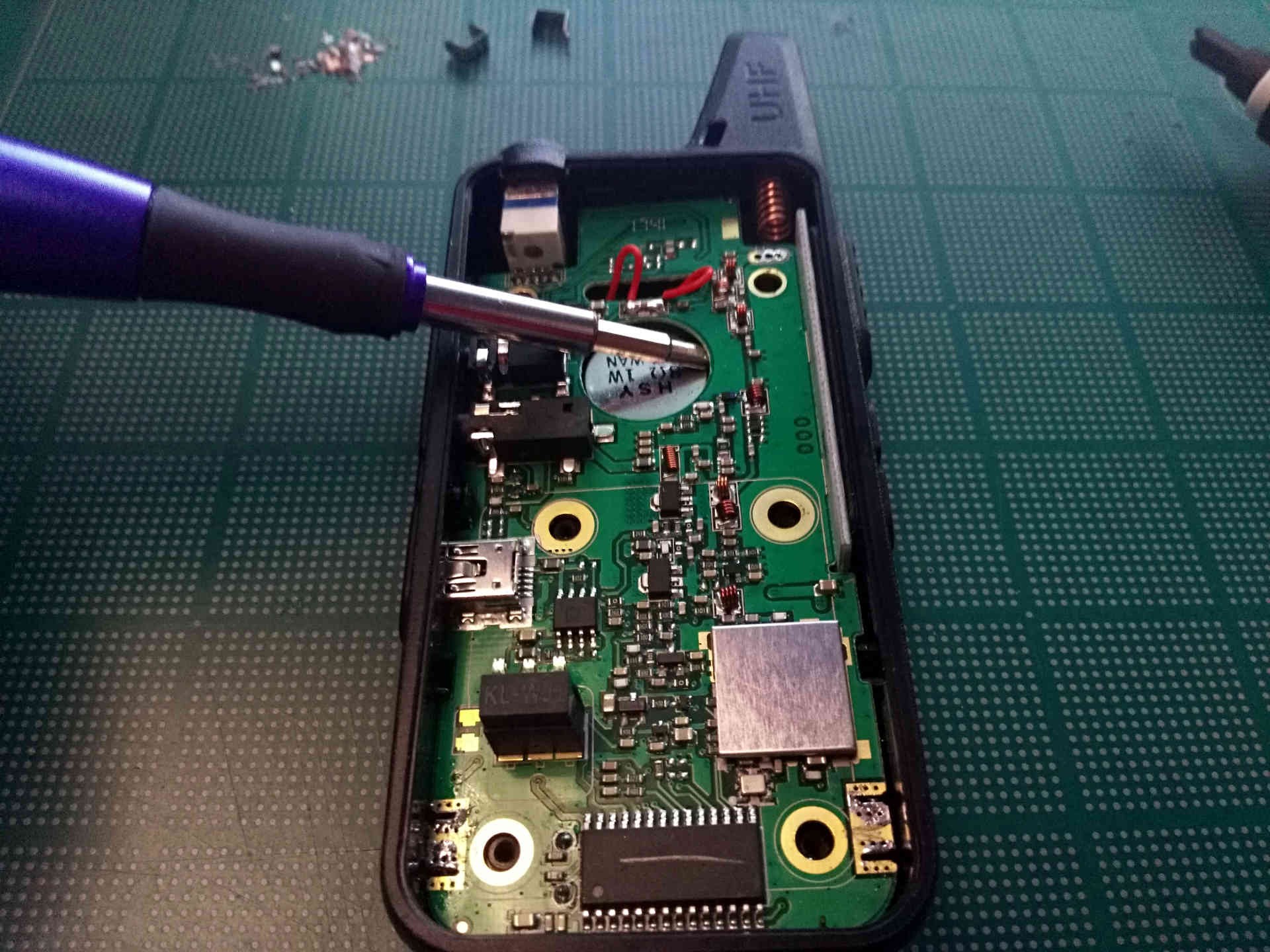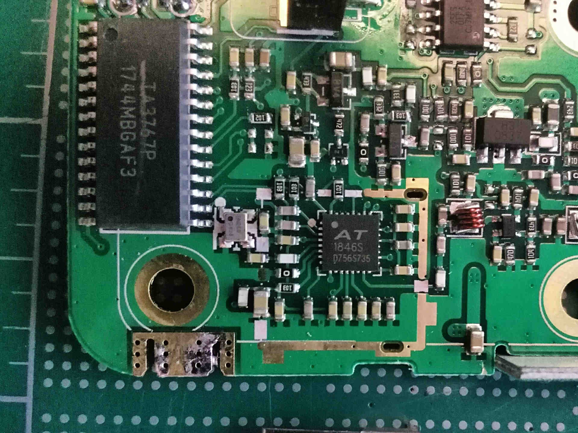 There is also what looks to be a custom microcontroller “TA3767P” and a radio transceiver IC “AT1846S” on the back of the board. I had to remove a metal shield to get access to the transceiver IC.