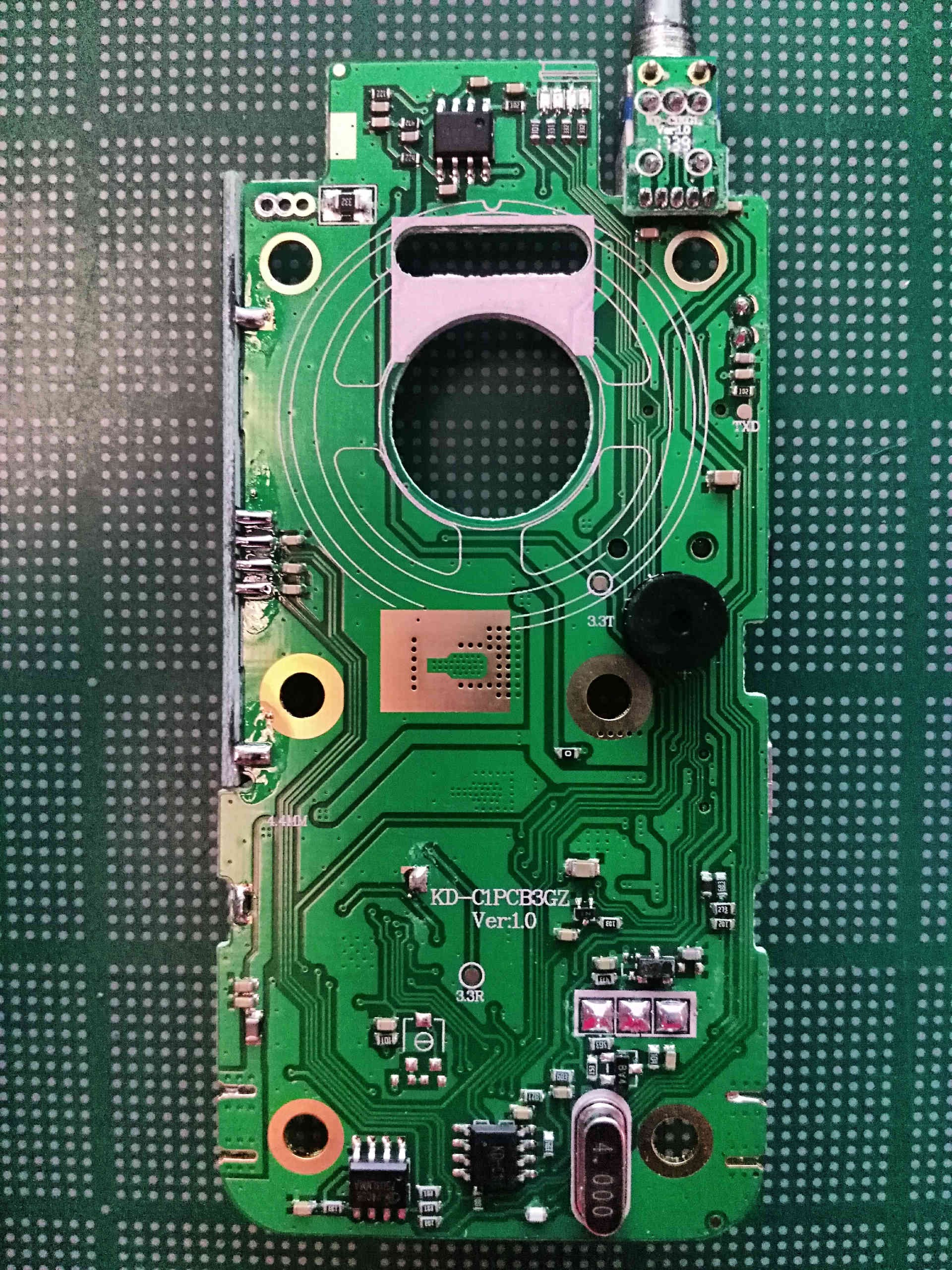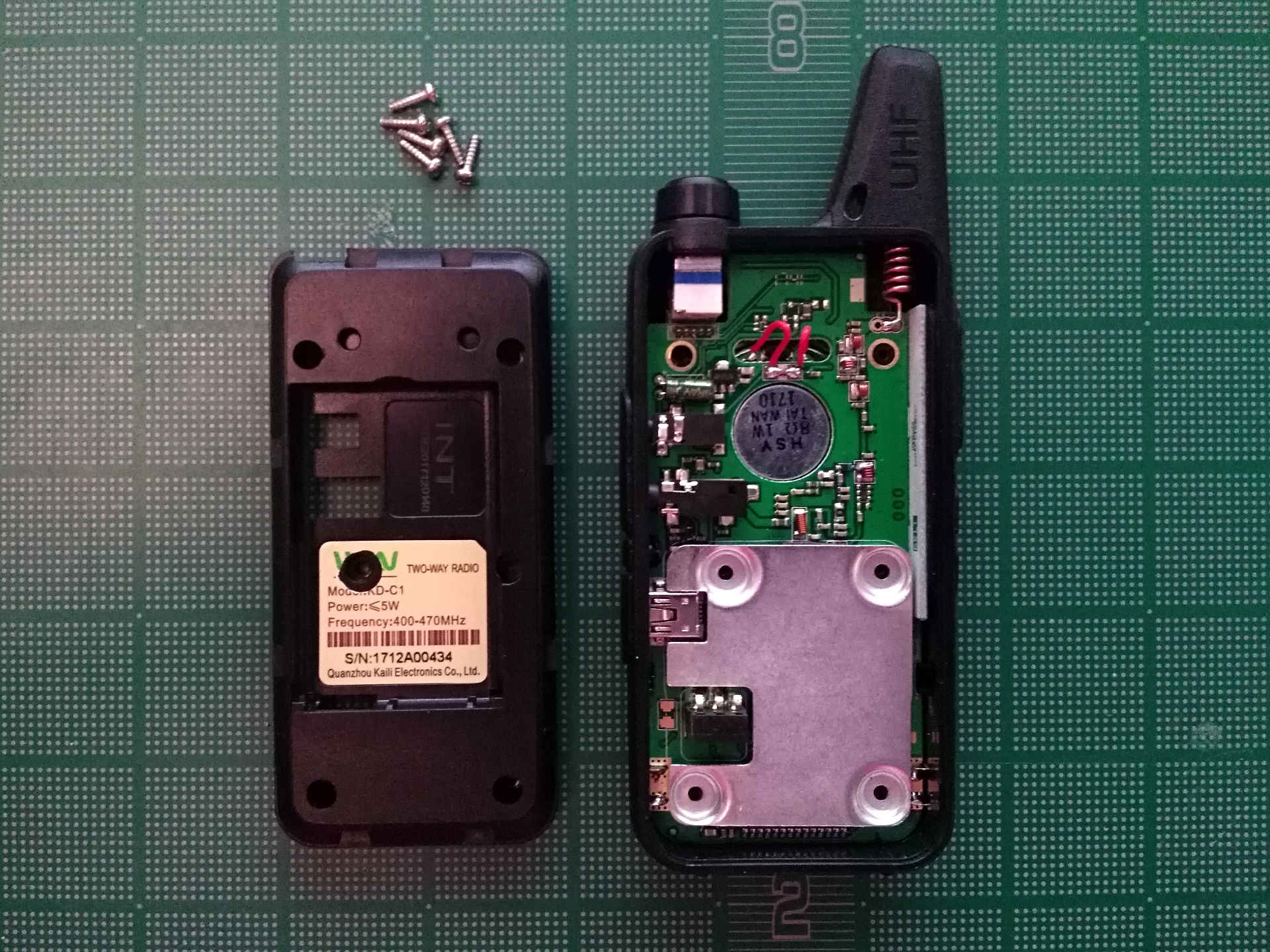 I tried to find a teardown of the KD-C1 before I purchased it. I managed to find a video of a partial teardown, but this video stops short of removing the PCB from the plastic case (for good reason as seen below). I decided to go deep and completely disassemble the radio as far as I could.