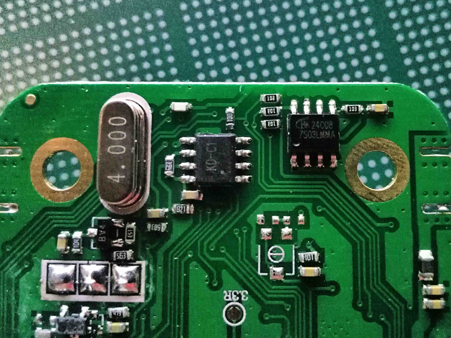 There are several 8-pin packages on the front of the board. One IC is labelled with the model number of the radio “KD-C1”, the other is labelled “HK24C08”.